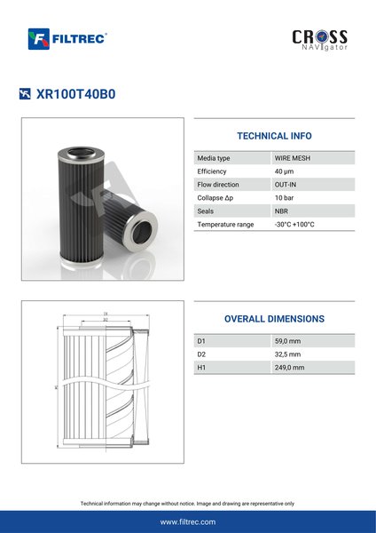 Genuine Filtrec XR100T40B0. This Filtrec element is designed to meet or exceed the quality and performance of brand OEM’s ensuring superior filtration performance and long-lasting durability.