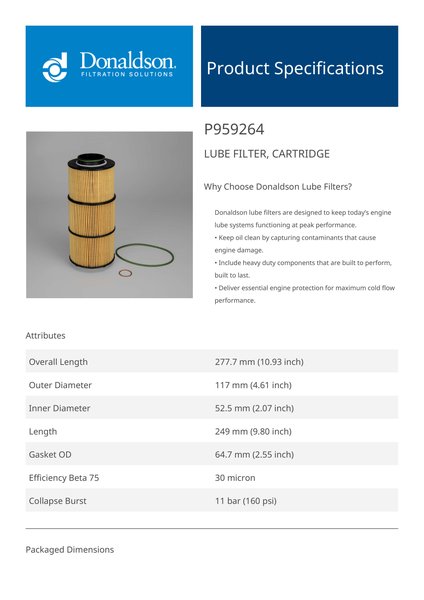 Genuine Donaldson P959264 Lube Filter, Cartridge ensures clean engine oil by effectively trapping harmful contaminants, promoting extended oil life and maintaining optimal engine efficiency. Its high-performance filtration media helps protect critical components from premature wear and supports consistent engine operation.Built for durability and long service intervals, this cartridge lube filter is ideal for demanding conditions. It offers excellent dirt-holding capacity and ensures reliable lubrication, contributing to improved engine longevity and reduced maintenance.