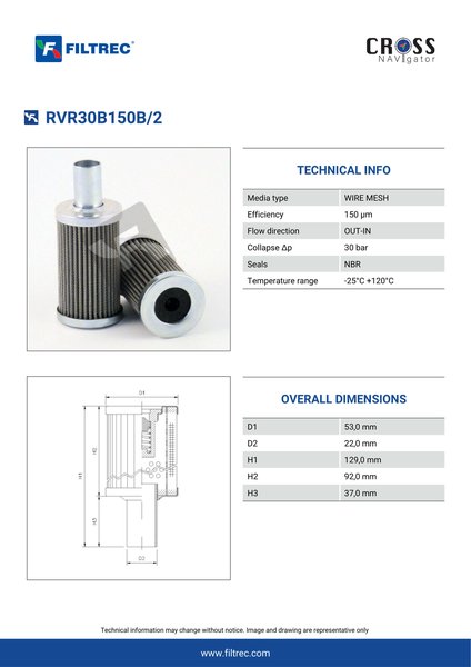 Genuine Filtrec RVR30B150B/2. This Filtrec element is designed to meet or exceed the quality and performance of brand OEM’s ensuring superior filtration performance and long-lasting durability.