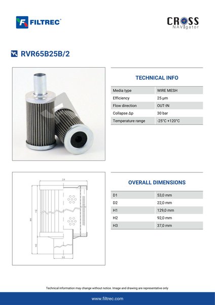 Genuine Filtrec RVR65B25B/2. This Filtrec element is designed to meet or exceed the quality and performance of brand OEM’s ensuring superior filtration performance and long-lasting durability.Engineered with their high performance media and a durable design, the RVR65B25B/2 provides reliable and consistent performance over its lifespan, even in harsh operating environments. When you order from FilterFinder, you can trust that you are getting a reliable and high-quality replacement filter that will keep your system running smoothly.