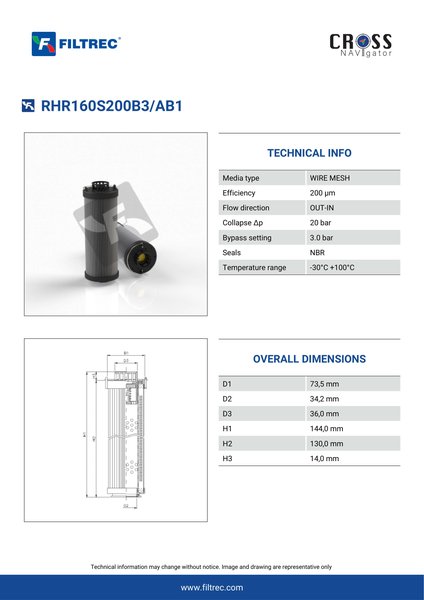 Genuine Filtrec RHR160S200B3/AB1. This Filtrec element is designed to meet or exceed the quality and performance of brand OEM’s ensuring superior filtration performance and long-lasting durability.Engineered with their high performance media and a durable design, the RHR160S200B3/AB1 provides reliable and consistent performance over its lifespan, even in harsh operating environments. When you order from FilterFinder, you can trust that you are getting a reliable and high-quality replacement filter that will keep your system running smoothly.