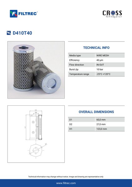 Genuine Filtrec D410T40. This Filtrec element is designed to meet or exceed the quality and performance of brand OEM’s ensuring superior filtration performance and long-lasting durability.