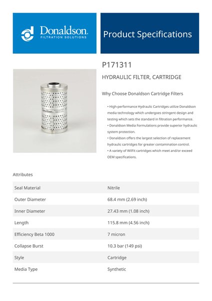 Genuine Donaldson P171311 Hydraulic Filter, Cartridge is designed to provide superior protection for your hydraulic system, effectively capturing contaminants to ensure clean fluid circulation. With high-quality filtration media, it extends equipment life, improves operational efficiency, and maintains fluid cleanliness even in the most demanding environments.