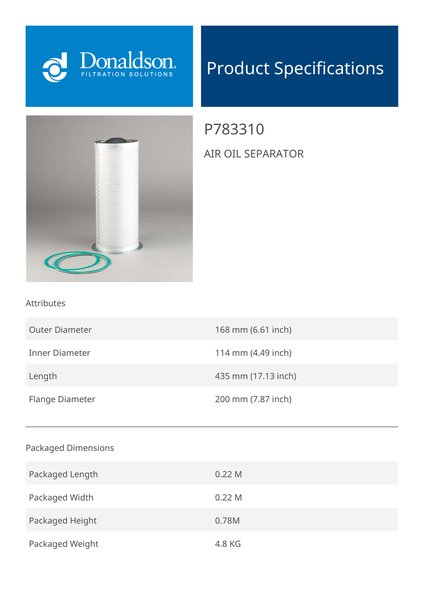 Genuine Donaldson P783310 Air Oil Separator is designed to separate oil from compressed air systems, reducing oil carryover and improving air quality. It enhances system efficiency and protects downstream equipment.