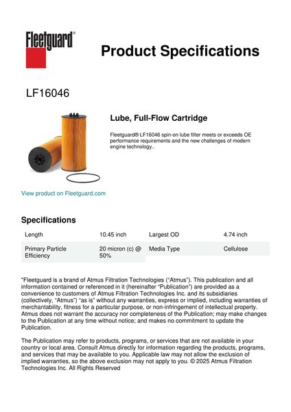 Fleetguard® LF16046 spin-on lube filter meets or exceeds OE performance requirements and the new challenges of modern engine technology..Specification