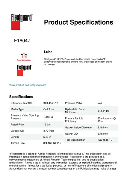 Fleetguard® LF16047 spin-on lube filter meets or exceeds OE performance requirements and the new challenges of modern engine technology.Specification