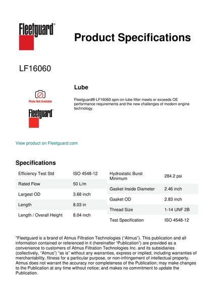 Fleetguard® LF16060 spin-on lube filter meets or exceeds OE performance requirements and the new challenges of modern engine technology.Specification