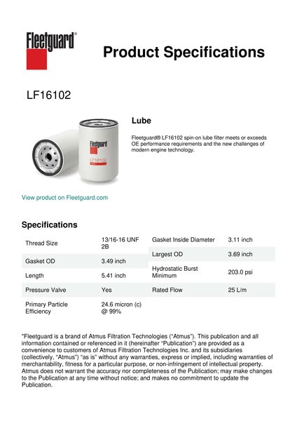 Fleetguard® LF16102 spin-on lube filter meets or exceeds OE performance requirements and the new challenges of modern engine technology.Specification