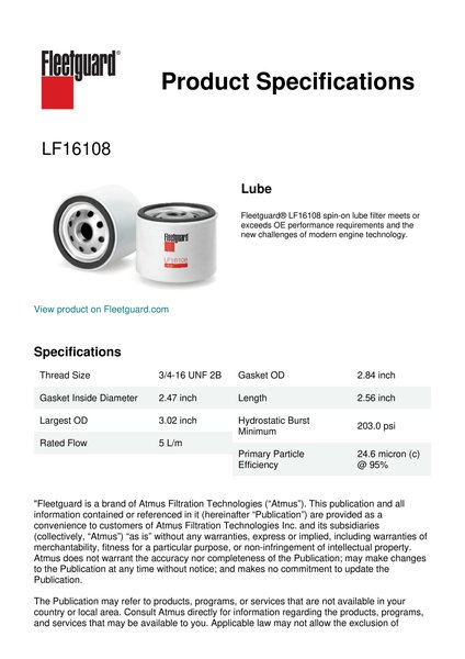 Fleetguard® LF16108 spin-on lube filter meets or exceeds OE performance requirements and the new challenges of modern engine technology.Specification