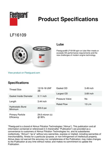 Fleetguard® LF16109 spin-on lube filter meets or exceeds OE performance requirements and the new challenges of modern engine technology.Specification