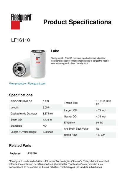 Fleetguard® LF16110 premium depth element lube filter incorporate superior filtration techniques to target the root of wear-causing particulate, namely soot.Specification