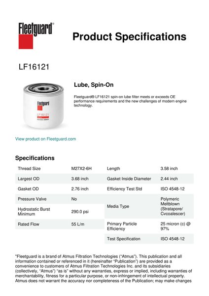 Fleetguard® LF16121 spin-on lube filter meets or exceeds OE performance requirements and the new challenges of modern engine technology.Specification