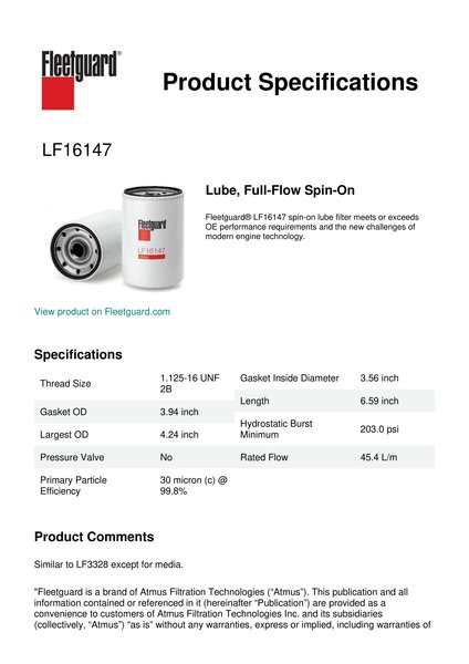 Fleetguard® LF16147 spin-on lube filter meets or exceeds OE performance requirements and the new challenges of modern engine technology.Specification