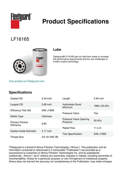 Fleetguard® LF16165 spin-on lube filter meets or exceeds OE performance requirements and the new challenges of modern engine technology.Specification
