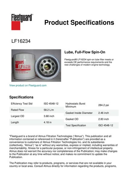 Fleetguard® LF16234 spin-on lube filter meets or exceeds OE performance requirements and the new challenges of modern engine technology.Specification