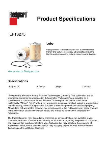Fleetguard® LF16275 cartridge oil filter is enviromentally friendly and features technology advances to achieve the high flow rates required by today’s modern engine designs.Specification