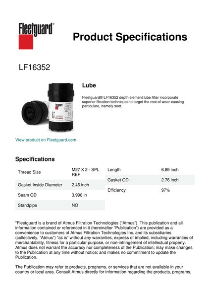 Fleetguard® LF16352 depth element lube filter incorporate superior filtration techniques to target the root of wear-causing particulate, namely soot.Specification