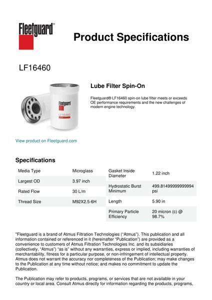 Fleetguard® LF16460 spin-on lube filter meets or exceeds OE performance requirements and the new challenges of modern engine technology.Specification