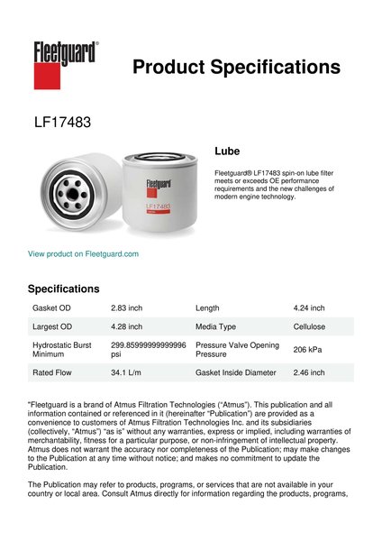 Fleetguard® LF17483 spin-on lube filter meets or exceeds OE performance requirements and the new challenges of modern engine technology.Specification