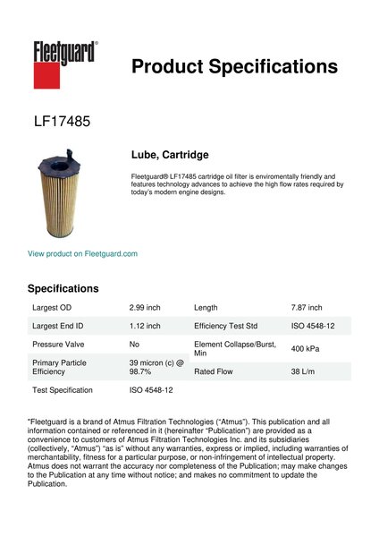 Fleetguard® LF17485 cartridge oil filter is enviromentally friendly and features technology advances to achieve the high flow rates required by today’s modern engine designs.Specification