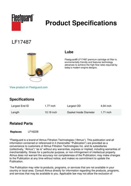 Fleetguard® LF17487 premium cartridge oil filter is enviromentally friendly and features technology advances to achieve the high flow rates required by today’s modern engine designs.Specification
