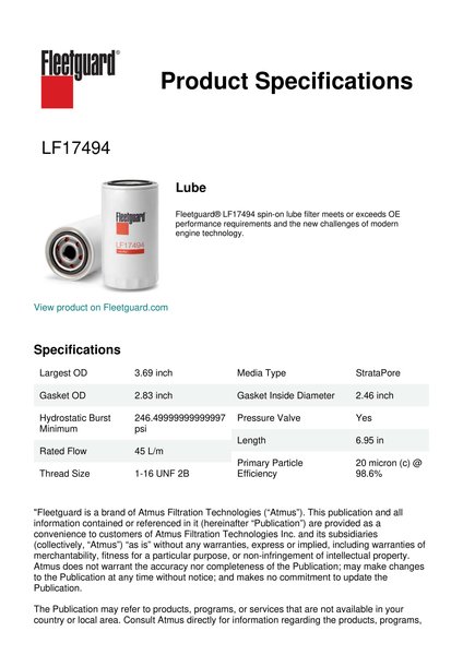 Fleetguard® LF17494 spin-on lube filter meets or exceeds OE performance requirements and the new challenges of modern engine technology.Specification