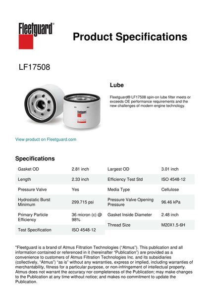 Fleetguard® LF17508 spin-on lube filter meets or exceeds OE performance requirements and the new challenges of modern engine technology.Specification