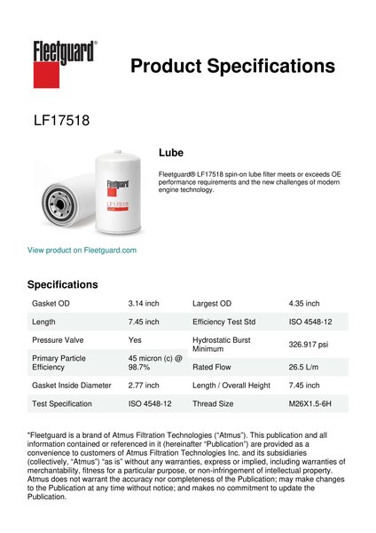 Fleetguard® LF17518 spin-on lube filter meets or exceeds OE performance requirements and the new challenges of modern engine technology.Specification