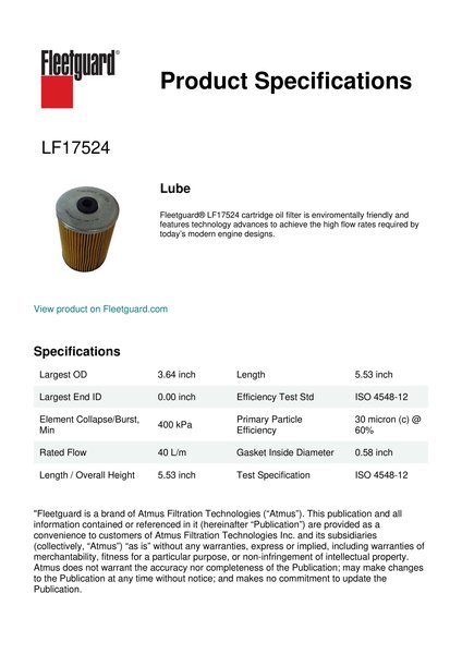 Fleetguard® LF17524 cartridge oil filter is enviromentally friendly and features technology advances to achieve the high flow rates required by today’s modern engine designs.Specification