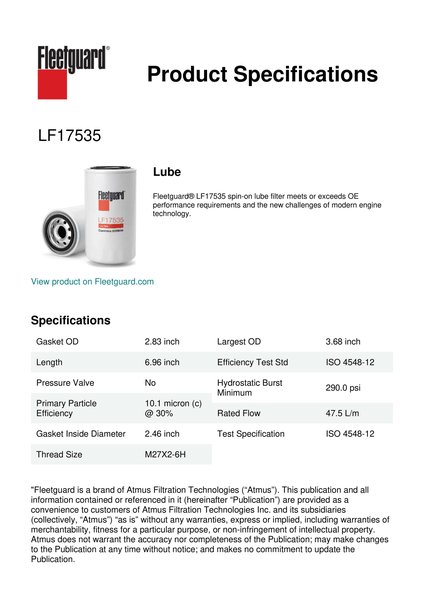 Fleetguard® LF17535 spin-on lube filter meets or exceeds OE performance requirements and the new challenges of modern engine technology.Specification