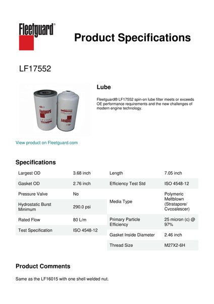 Fleetguard® LF17552 spin-on lube filter meets or exceeds OE performance requirements and the new challenges of modern engine technology.Specification