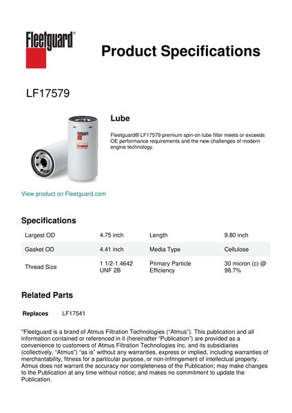 Fleetguard® LF17579 premium spin-on lube filter meets or exceeds OE performance requirements and the new challenges of modern engine technology.Specification