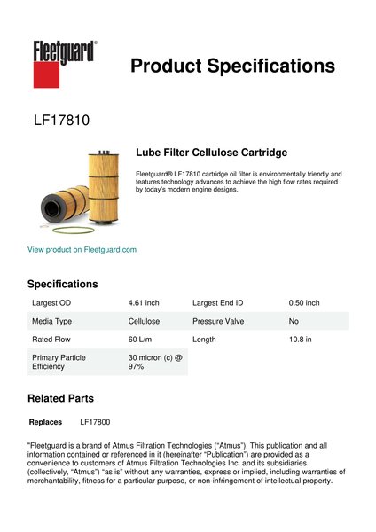 Fleetguard® LF17810 cartridge oil filter is environmentally friendly and features technology advances to achieve the high flow rates required by today’s modern engine designs.Specification