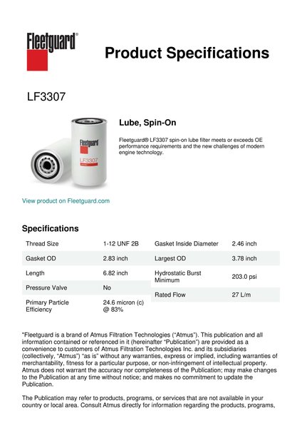 Fleetguard® LF3307 spin-on lube filter meets or exceeds OE performance requirements and the new challenges of modern engine technology.Specification