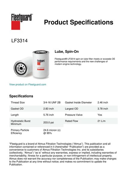 Fleetguard® LF3314 spin-on lube filter meets or exceeds OE performance requirements and the new challenges of modern engine technology.Specification