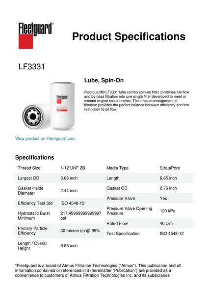 Fleetguard® LF3331 lube combo spin-on filter combines full-flow and by-pass filtration into one single filter developed to meet or exceed engine requirements. This unique arrangement of filtration provides the perfect balance between efficiency and low restriction to oil flow.Specification