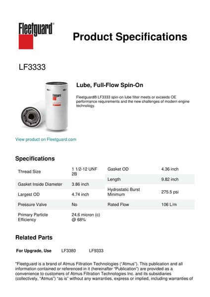 Fleetguard® LF3333 spin-on lube filter meets or exceeds OE performance requirements and the new challenges of modern engine technology.Specification