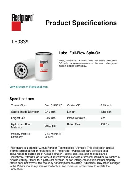 Fleetguard® LF3339 spin-on lube filter meets or exceeds OE performance requirements and the new challenges of modern engine technology.Specification