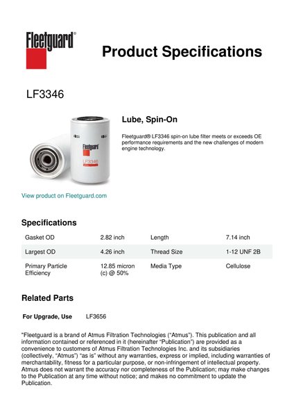 Fleetguard® LF3346 spin-on lube filter meets or exceeds OE performance requirements and the new challenges of modern engine technology.Specification