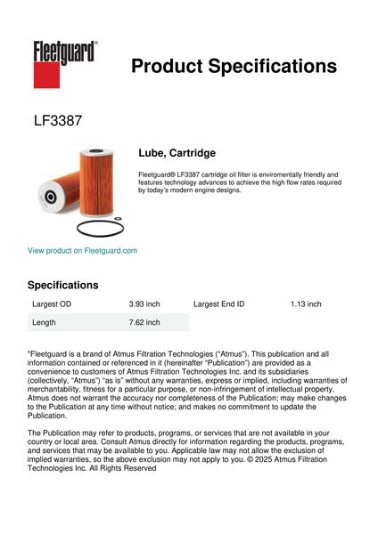 Fleetguard® LF3387 cartridge oil filter is enviromentally friendly and features technology advances to achieve the high flow rates required by today’s modern engine designs.Specification