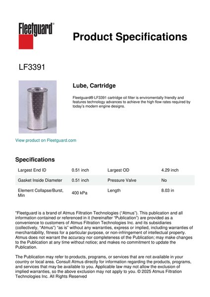 Fleetguard® LF3391 cartridge oil filter is enviromentally friendly and features technology advances to achieve the high flow rates required by today’s modern engine designs.Specification