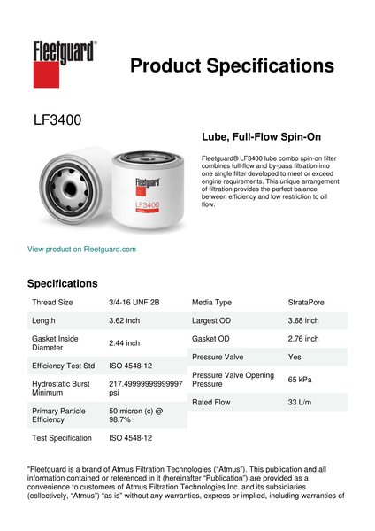 Fleetguard® LF3400 lube combo spin-on filter combines full-flow and by-pass filtration into one single filter developed to meet or exceed engine requirements. This unique arrangement of filtration provides the perfect balance between efficiency and low restriction to oil flow.Specification