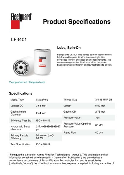 Fleetguard® LF3401 lube combo spin-on filter combines full-flow and by-pass filtration into one single filter developed to meet or exceed engine requirements. This unique arrangement of filtration provides the perfect balance between efficiency and low restriction to oil flow.Specification
