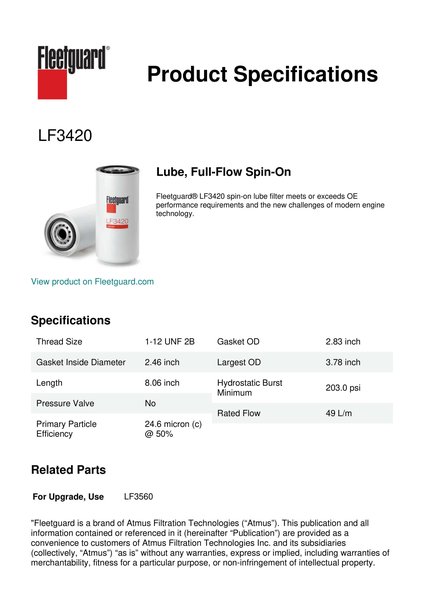 Fleetguard® LF3420 spin-on lube filter meets or exceeds OE performance requirements and the new challenges of modern engine technology.Specification