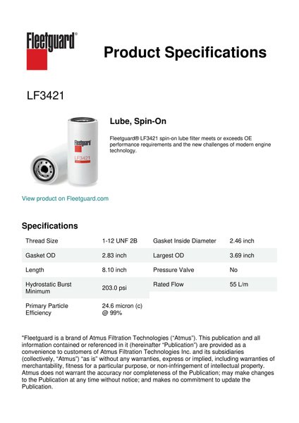 Fleetguard® LF3421 spin-on lube filter meets or exceeds OE performance requirements and the new challenges of modern engine technology.Specification