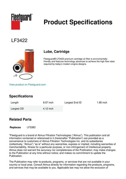 Fleetguard® LF3422 premium cartridge oil filter is enviromentally friendly and features technology advances to achieve the high flow rates required by today’s modern engine designs.Specification