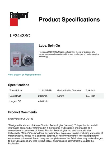 Fleetguard® LF3443SC spin-on lube filter meets or exceeds OE performance requirements and the new challenges of modern engine technology.Specification