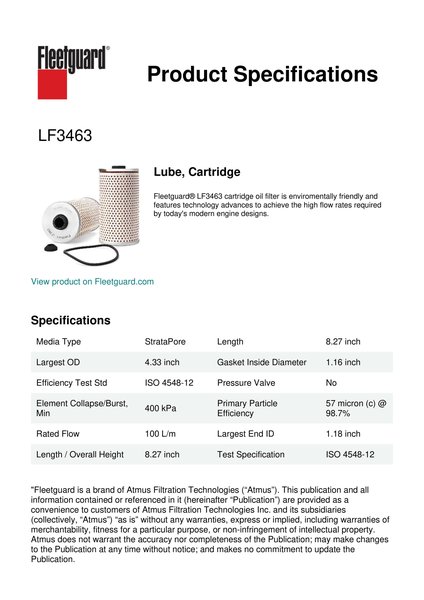 Fleetguard® LF3463 cartridge oil filter is enviromentally friendly and features technology advances to achieve the high flow rates required by today's modern engine designs.Specification
