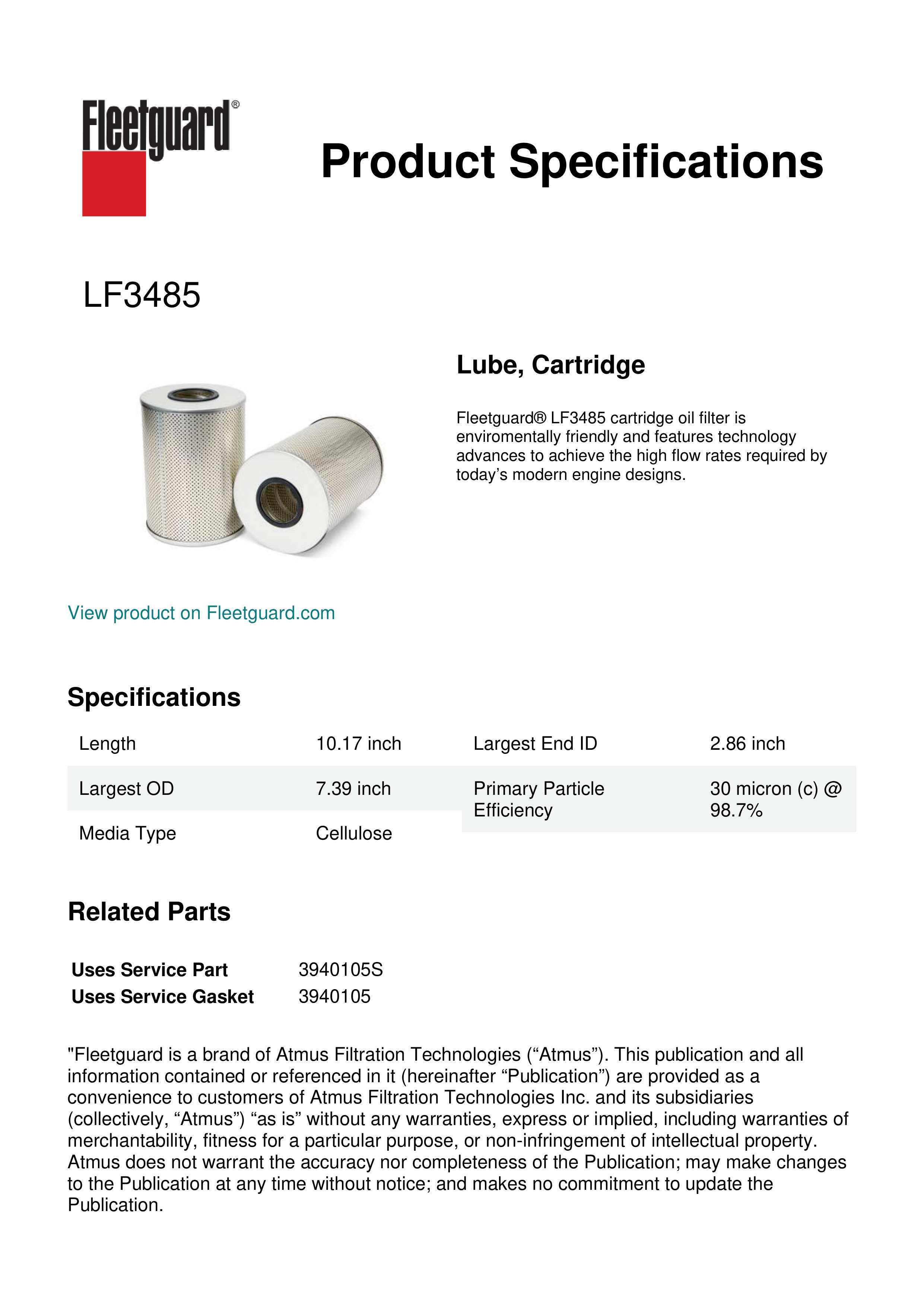 Fleetguard® LF3485 cartridge oil filter is enviromentally friendly and features technology advances to achieve the high flow rates required by today’s modern engine designs.Specification