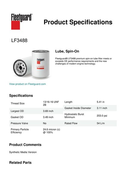 Fleetguard® LF3488 premium spin-on lube filter meets or exceeds OE performance requirements and the new challenges of modern engine technology.Specification